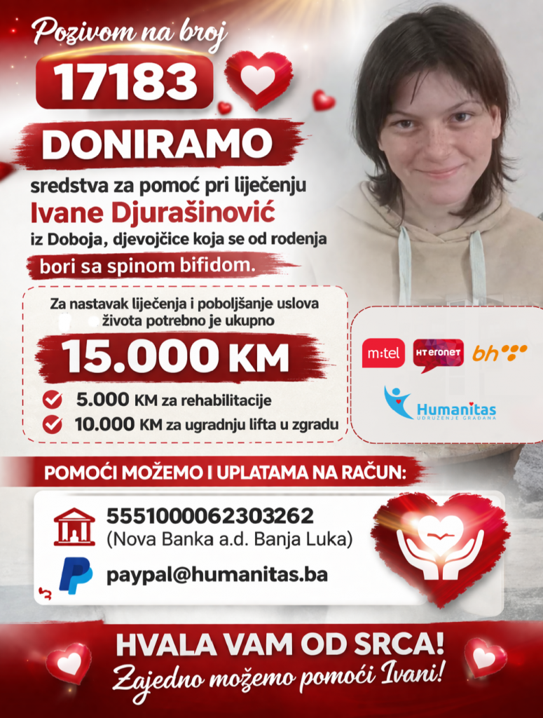 Humanitas pokreće donatorsku akciju za podršku pri liječenju Ivane Djurašinović (2012) iz Doboja, djevojčice koja se od rođenja bori sa teškim zdravstvenim stanjem – spinom bifidom.