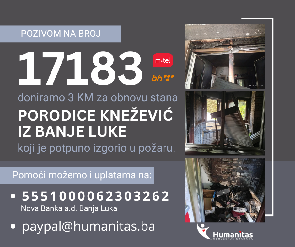 Porodica Knežević iz Banje Luke ostala je bez doma nakon što je u ranim jutarnjim satima 13.11.2025. godine njihov stan izgorio u požaru.