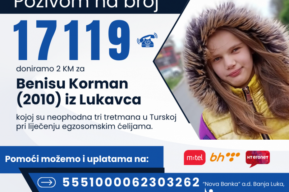 Početak akcije: 15.01.2026. Humanitas pokreće drugu humanitarnu akciju za liječenje Benise Korman (2010) iz Lukavca, djevojčice koja trpi teške posljedice brutalnog fizičkog zlostavljanja i ima ozbiljna oštećenja desne strane mozga. Benisa je tokom prethodnog boravka u Istanbulu pregledana u jednoj od najsavremenijih specijalizovanih bolnica, gdje… Read More »17119 za liječenje Benise Korman iz Lukavca