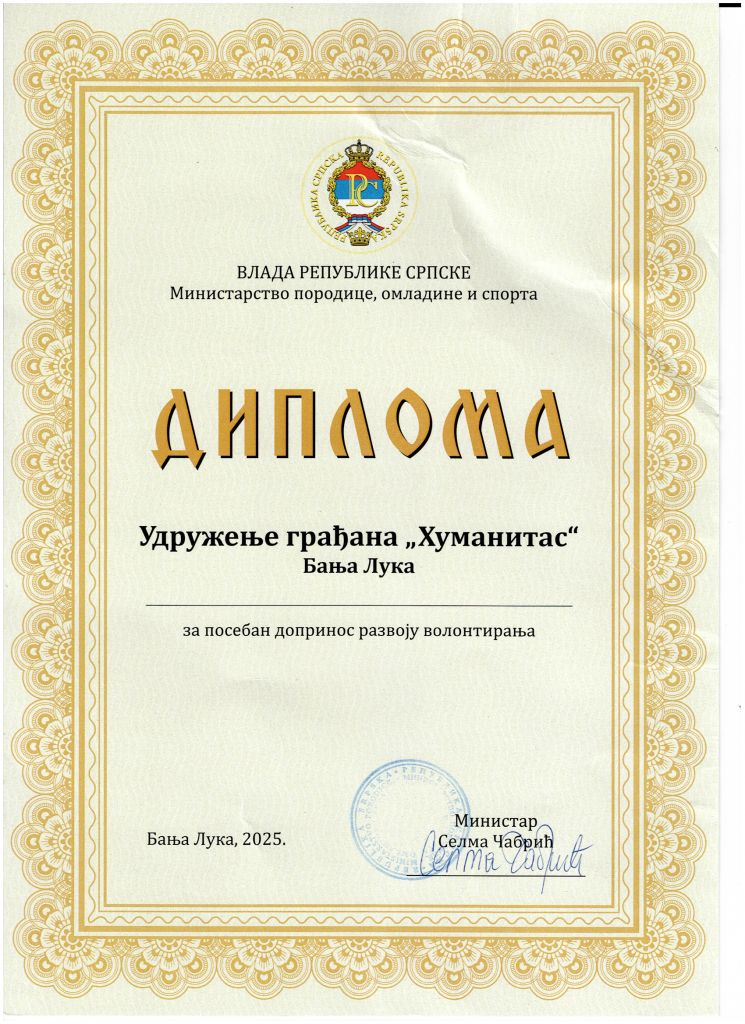 Ministarstvo porodice, omladine i sporta Republike Srpske dodijelilo je godišnje nagrade najboljim volonterima i organizatorima volonterskih aktivnosti, a među dobitnicima je i naš Aleksandar Došenović, predsjednik UG Humanitas.