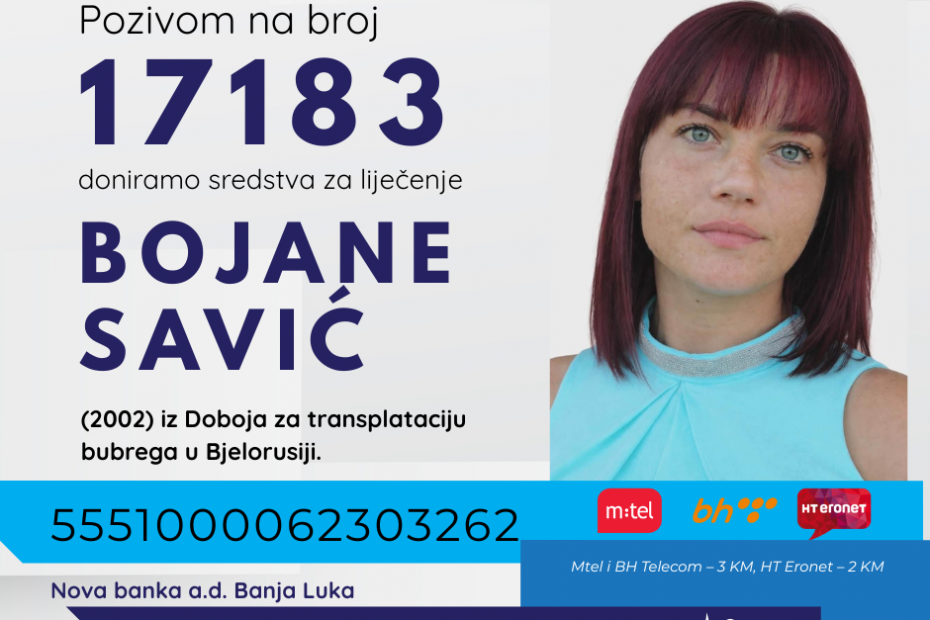 Bojana ima 23 godine, udata je i već godinama je na dijalizi. Njeno zdravstveno stanje nije dobro, ali se pojavila nova nada – mogućnost transplantacije bubrega u Bjelorusiji. Troškove same transplantacije snosi Fond, međutim, porodica mora obezbijediti sredstva za put, pripreme za operaciju i boravak u inostranstvu, što ukupno iznosi oko 20.000 EUR – iznos koji sami nisu u mogućnosti prikupiti.