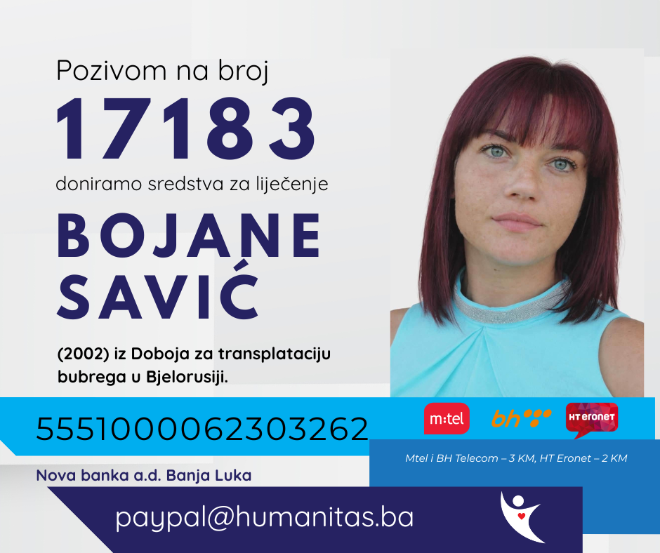 Humanitas pokreće donatorsku akciju za podršku pri liječenju Bojane Savić (2002) iz Doboja, mlade žene koja već pet godina vodi tešku i iscrpljujuću borbu s bolešću bubrega.