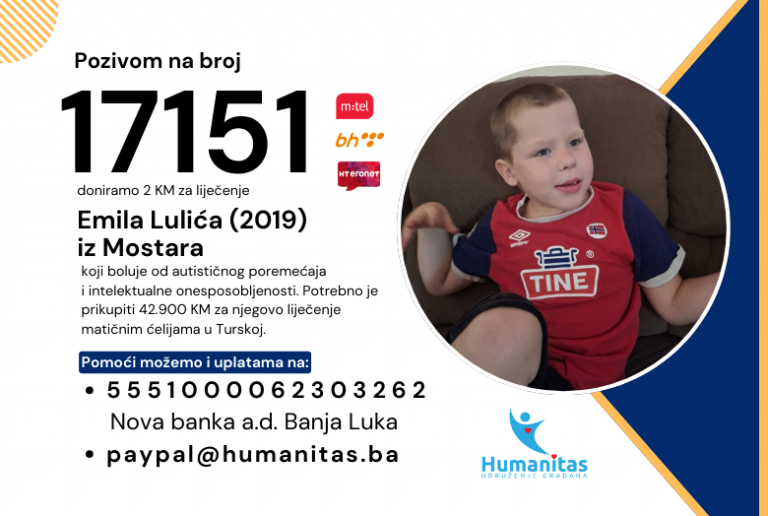 Humanitarna akcija za prikupljanje pomoći za liječenje dječaka Emila Lulića (2019) iz Mostara, koju je pokrenulo Udruženje građana Humanitas, završena je 30. septembra 2025. godine. Tokom trajanja akcije, koja je imala za cilj da prikupi sredstva u iznosu od 42.900 KM, prikupljeno je 639 KM putem donacija građana. Iako cilj nije u potpunosti ostvaren, iz … Nastavi čitati Završena akcija za Emila Lulića iz Mostara